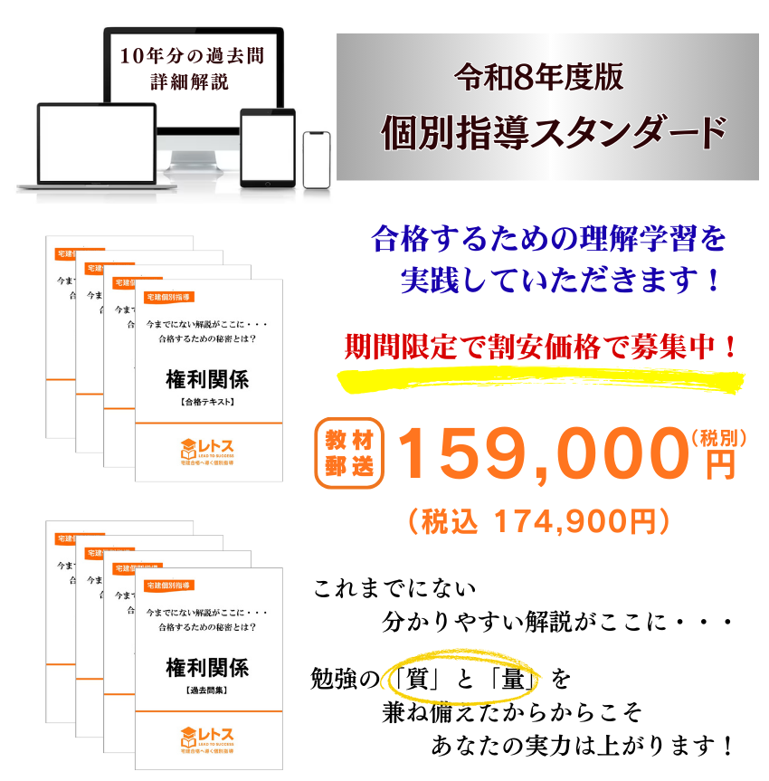 「権利関係」「宅建業法」「法令上の制限」「税その他」各1回ずつ合計4回で四択問題の解き方を身につけてください!